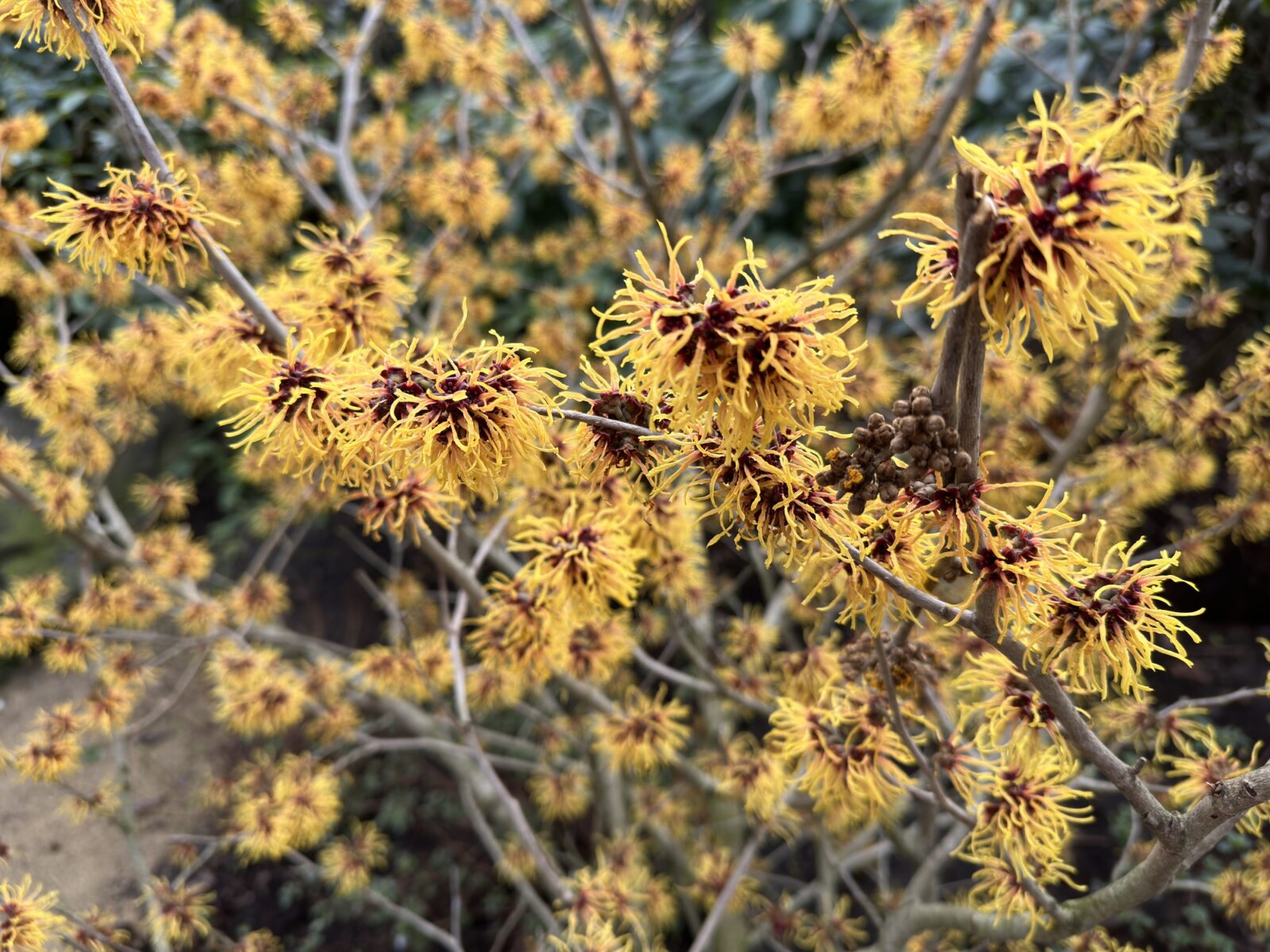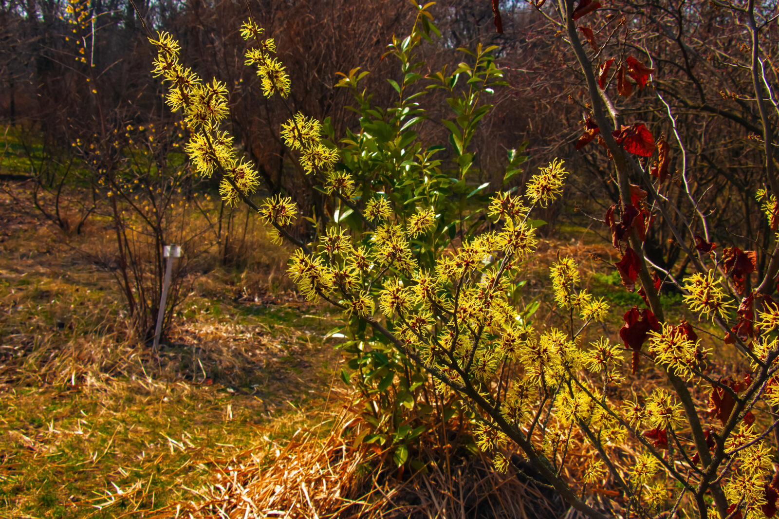 Tento rozkladitý opadavý keř působí po opadu listů chvíli nenápadně, ale jen do doby, než se v prosinci začnou otevírat první květní pupeny. Celá rostlina se postupně pokryje jemnými, výrazně žlutými okvětními lístky, které působí téměř exoticky.
