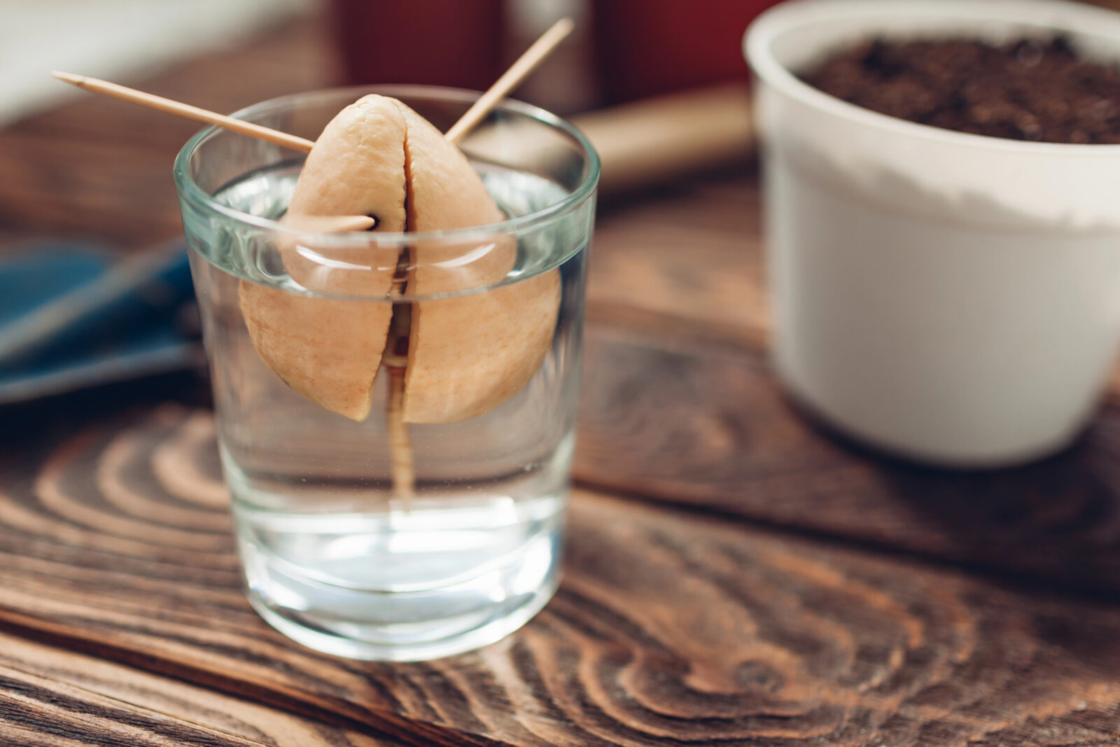 Píchnutím párátek zhruba v polovině vytvoř oporu, aby mohla pecka „sedět“ nad vodou v otevřené sklenici – dolní část ponořená asi 1 cm. Sklenici dej na světlé a teplé místo, ale ne na přímé slunce. Vodu pravidelně dolévej a měň každých pár dní.